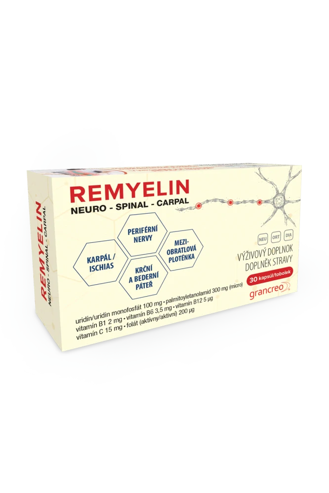 REMYELIN obsahuje kombináciu uridínu, palmitoyletanolamidu, vitamínov sk. B, vitamínu C a biologicky aktívnej kyseliny listovej. Je vhodný pre ľudí s bolesťou v krížoch, neuropatickou bolesťou chrbta, karpálu a pri vyskočenej platničke.